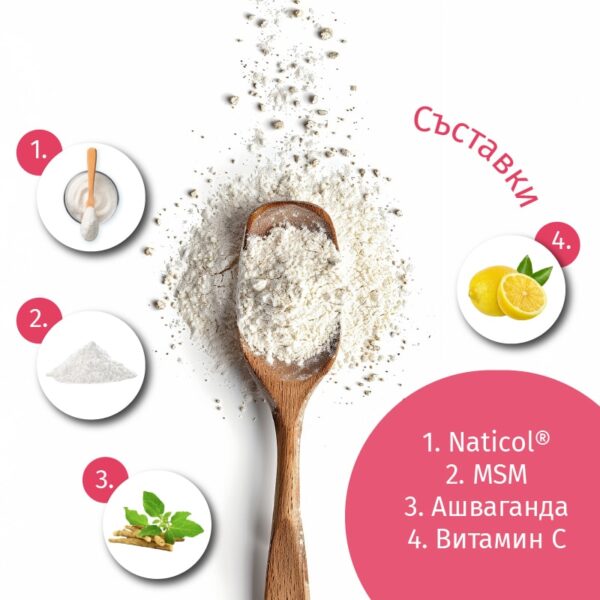 Съставки: Naticol® хидролизиран рибен колаген на прах (50%), малтодекстрин, MSM (метилсулфонилметан), ашваганда на прах, натурална ягода ароматика (2%), натурално оцветител от червено цвекло, стабилизатор: целулоза на прах, витамин C (аскорбинова киселина), сладител стевиол гликозид.