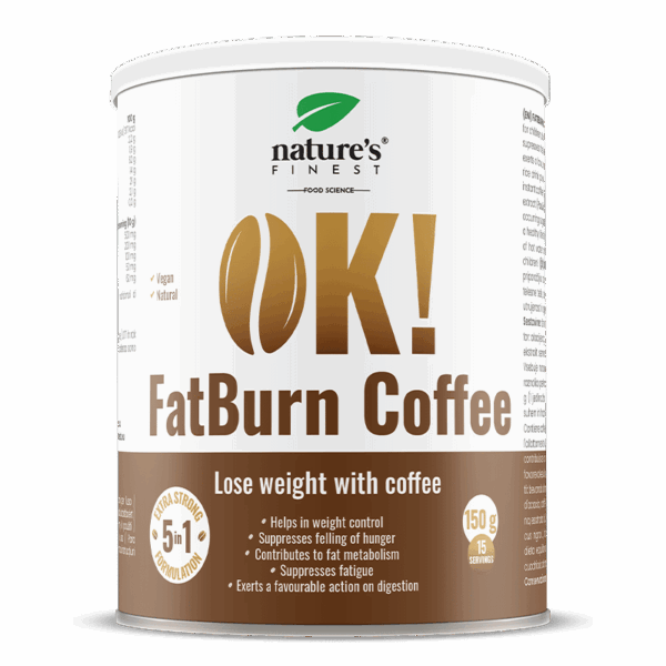 OK!FatBurn Coffee е кафен напиток с 5-в-1 действие за намаляване на апетита и умората². Съдържа инстант кафе (Coffea arabica L.) като обикновеното кафе, но е обогатено с мощни активни съставки: L-карнитин (100 mg), екстракт от гуарана (100 mg) и екстракт от бъз (50 mg) на порция.