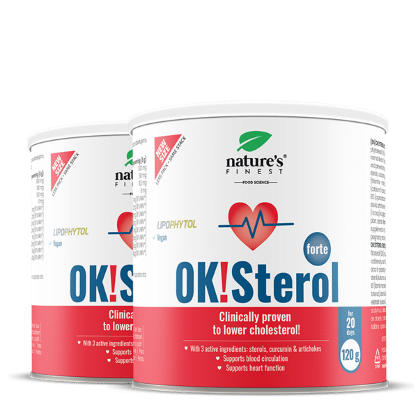 OK!Sterol Forte съдържа патентования Lipophytol® с фитостероли, които допринасят за поддържане на нормалните нива на холестерола в кръвта¹. Артишокът също помага за намаляване на нивото на липидите в кръвта³, докато куркумата поддържа здравето на сърцето².
