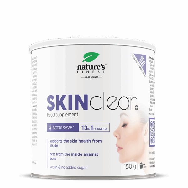 SKINclear+ съдържа 6 мощни активни съставки, включително патентования Actrisave™, който действа отвътре против акне и подкрепя здравето на кожата отвътре. Формулата допринася за регулирането на хормоналната активност³ и помага да подобрите физиологичния баланс и хидратацията на кожата⁴.